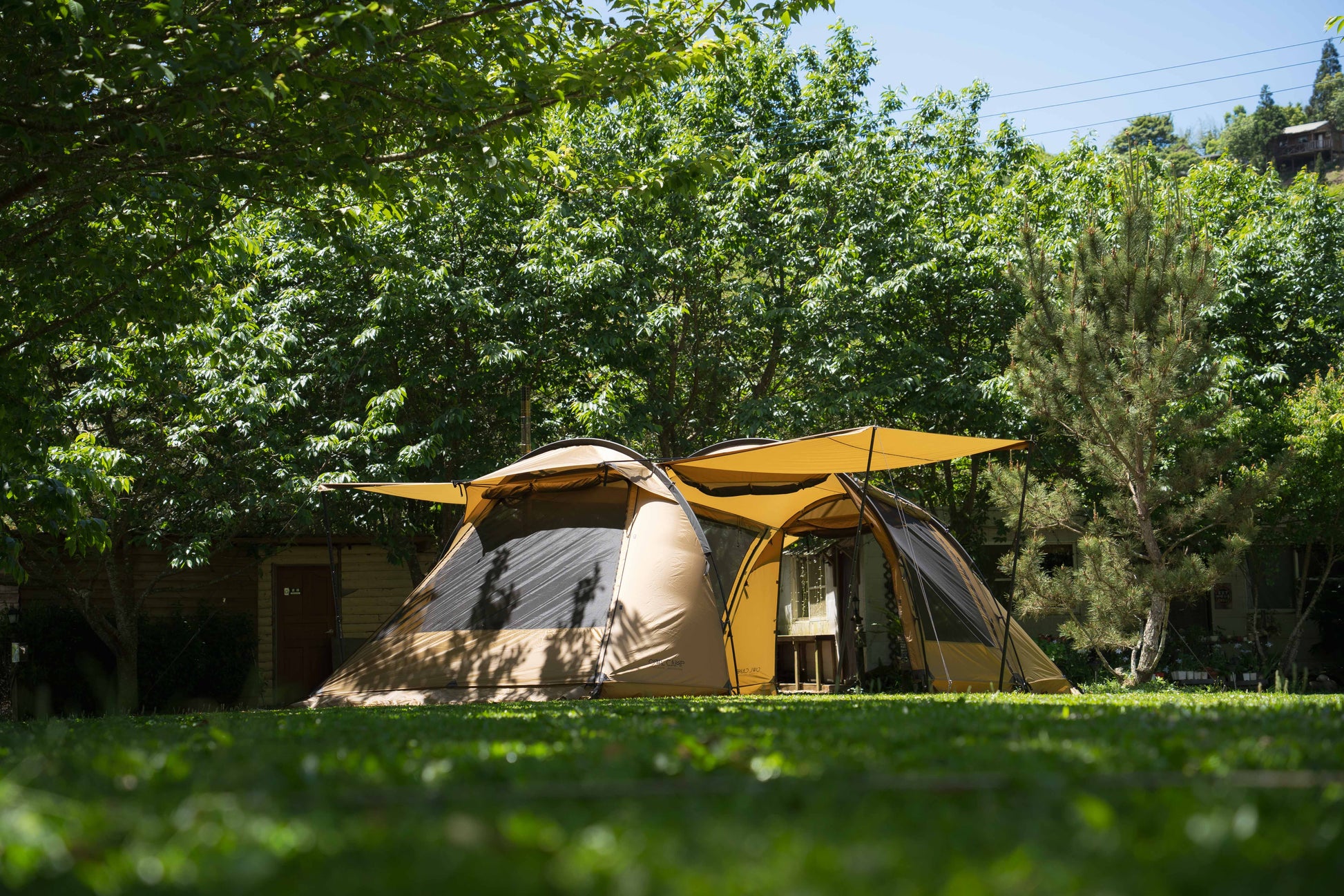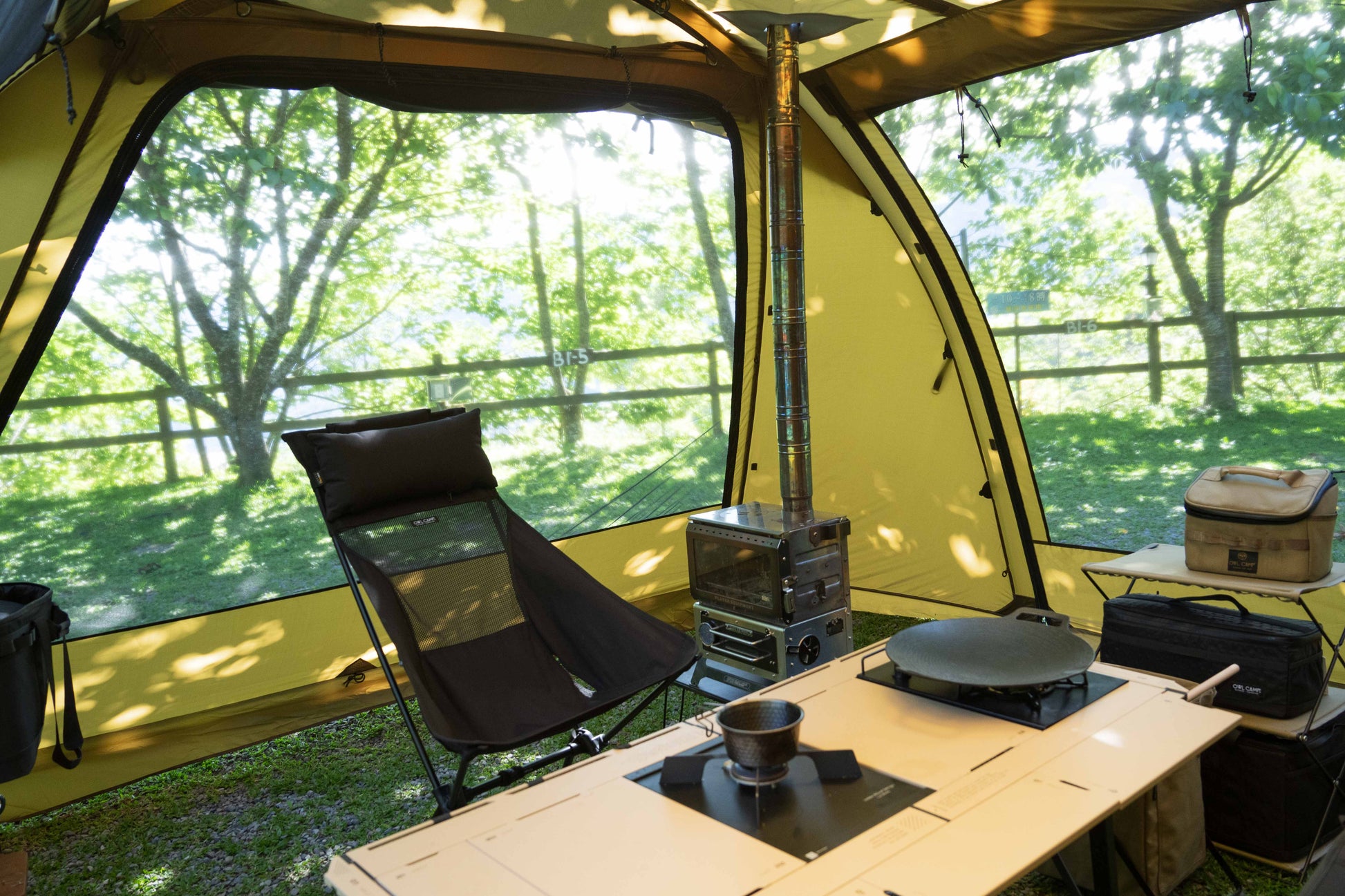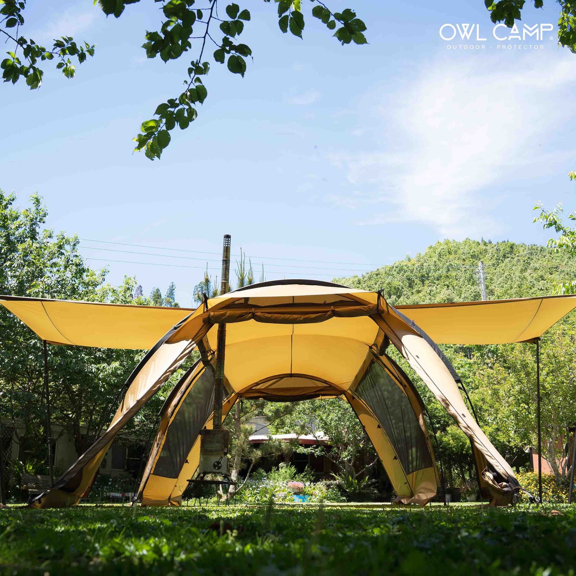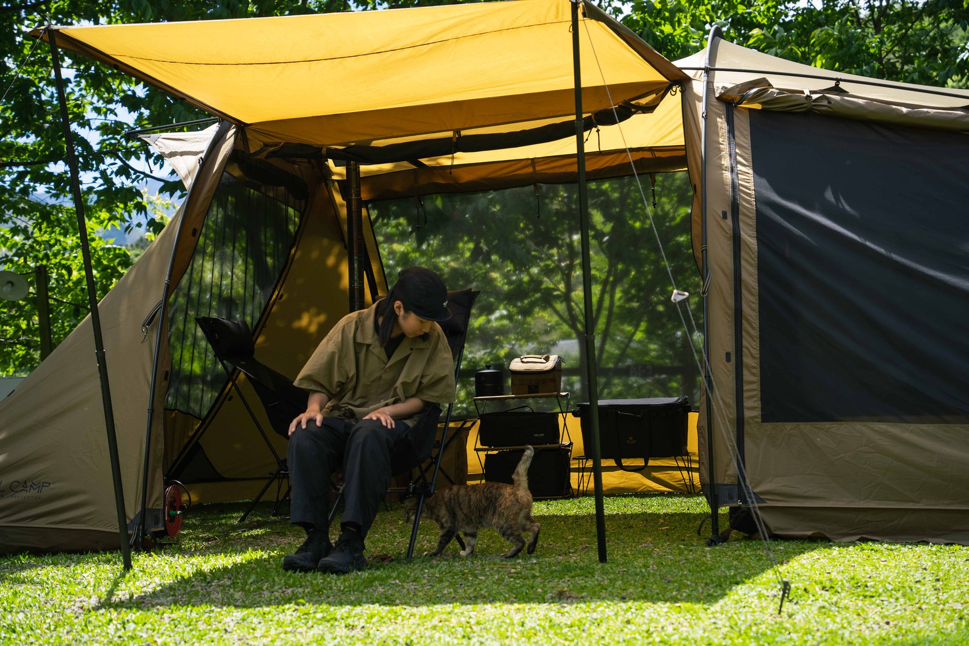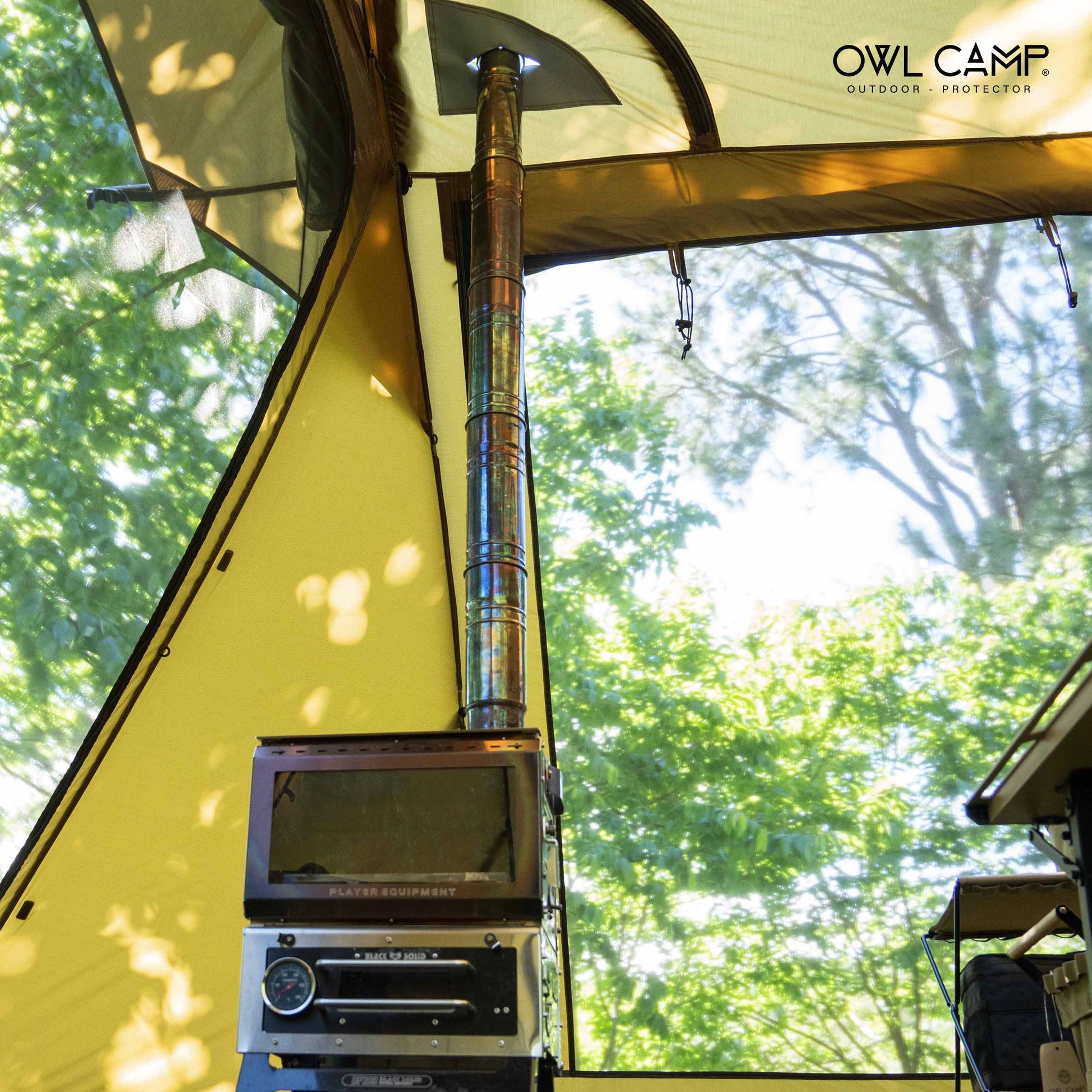 豪雨を防ぐ「フルスカート」仕様。負荷がかかるポイントは「ダイニーマ(Dyneema)」で補強。さらに「薪ストーブ用煙突ポート」を標準装備し、冬の焚き火キャンプも楽しめます。 - ストレスフリーな前庭と独自の生地