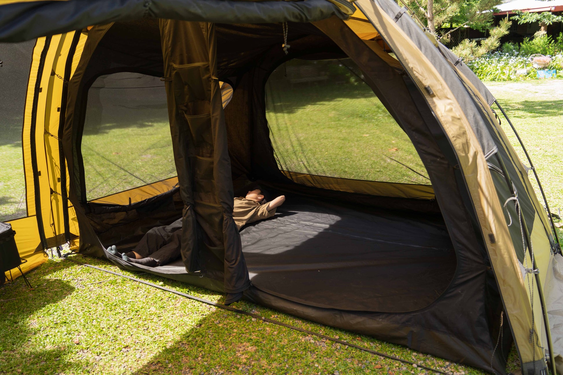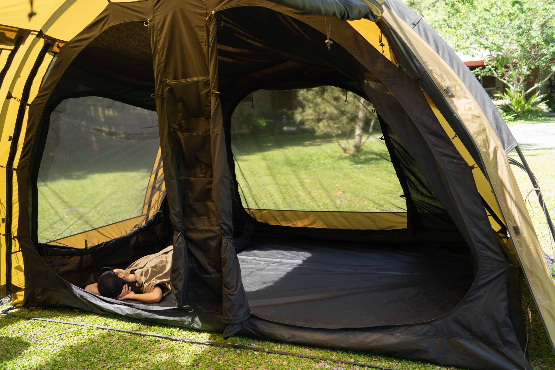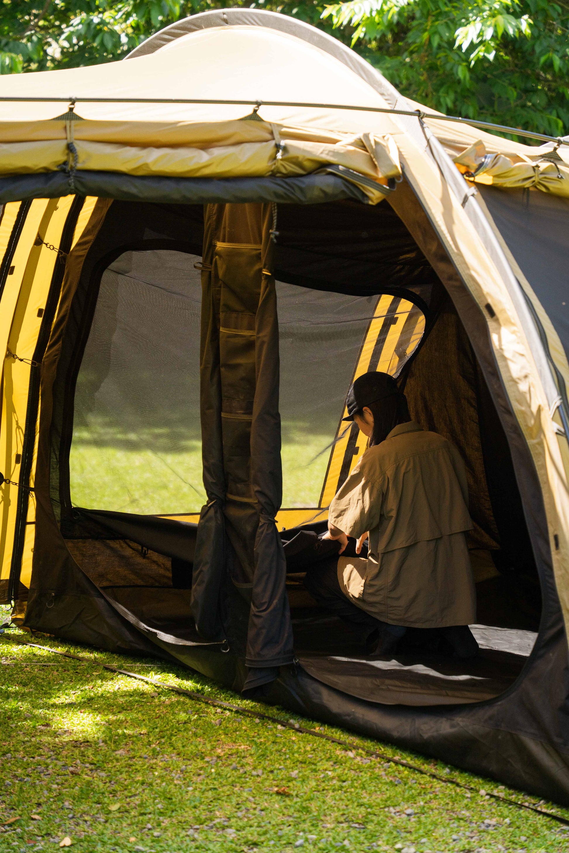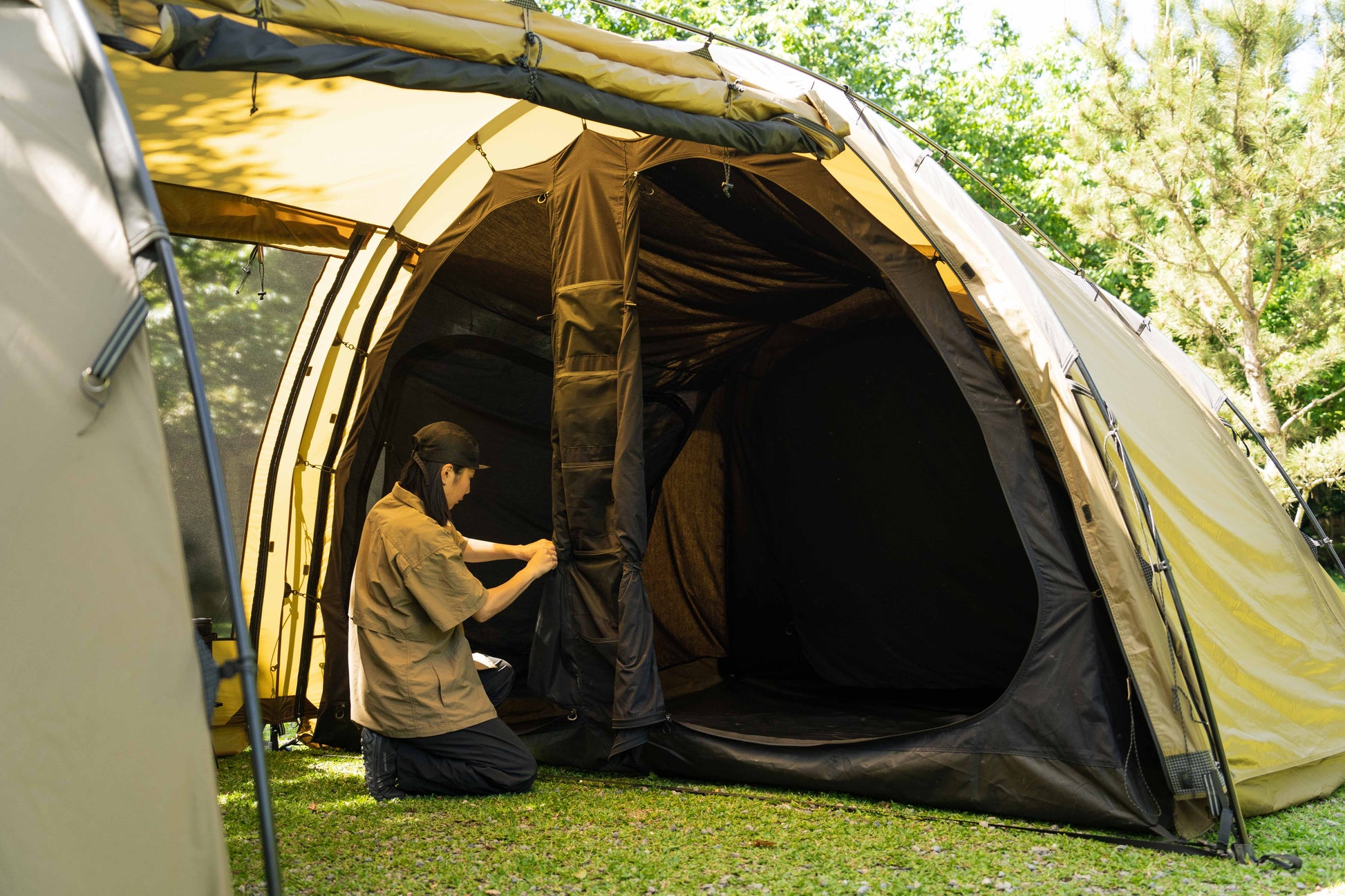 アウター・インナー共に360度全方位にメッシュ窓を配置。寝室部分の天井高は200cmと高く、圧迫感はゼロ。XLサイズのマットを敷いても、家族5人でゆったり眠れる広さです。 - 利便性を追求したディテール